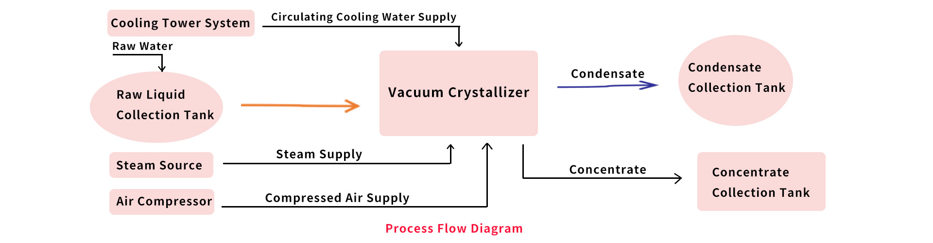 The client is a research institution. The objective of this project is to recover solid crystalline salt from high-salinity brine generated in the production process via evaporation crystallization. A vacuum crystallization system is required to dehydrate the brine, ultimately producing solid crystalline salt with a moisture content ≤10%. The high-salinity brine has a flow rate of 5 tons per day.