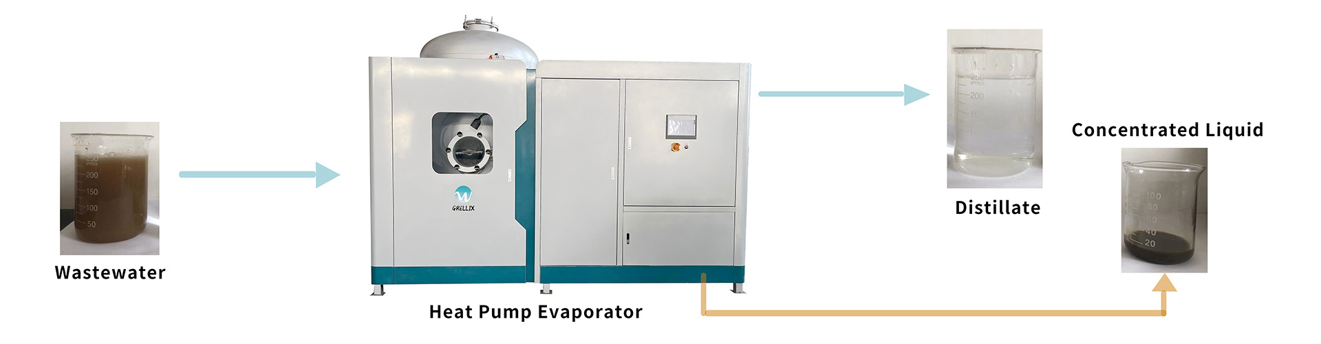 The solution directly enters the GRELLIX vacuum evaporator, where it undergoes boiling and evaporation at 35°C under negative pressure, producing 90% clear distilled water that can be reused or discharged after meeting standards. Only 10% of the concentrate remains, which can be treated as hazardous waste or used to recover raw materials or by-products. This process helps enterprises save costs and improve efficiency.
