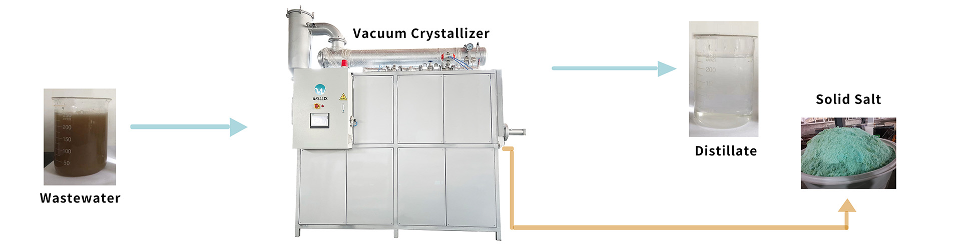 High-concentration feed liquids can be directly fed into the GRELLIX Vacuum Crystallizer without pretreatment. Powered by steam and operating at 55°C under negative pressure, the system achieves boiling evaporation, separating 95% of clear distillate (meeting discharge standards or reusable) from the feedstock. Only <10% moisture-content solid/semi-solid residues remain, which can be safely disposed as hazardous waste or repurposed for raw material recovery/by-product extraction. This process slashes operational costs while delivering unmatched efficiency, transforming wastewater treatment into a value-driven operation for industries.