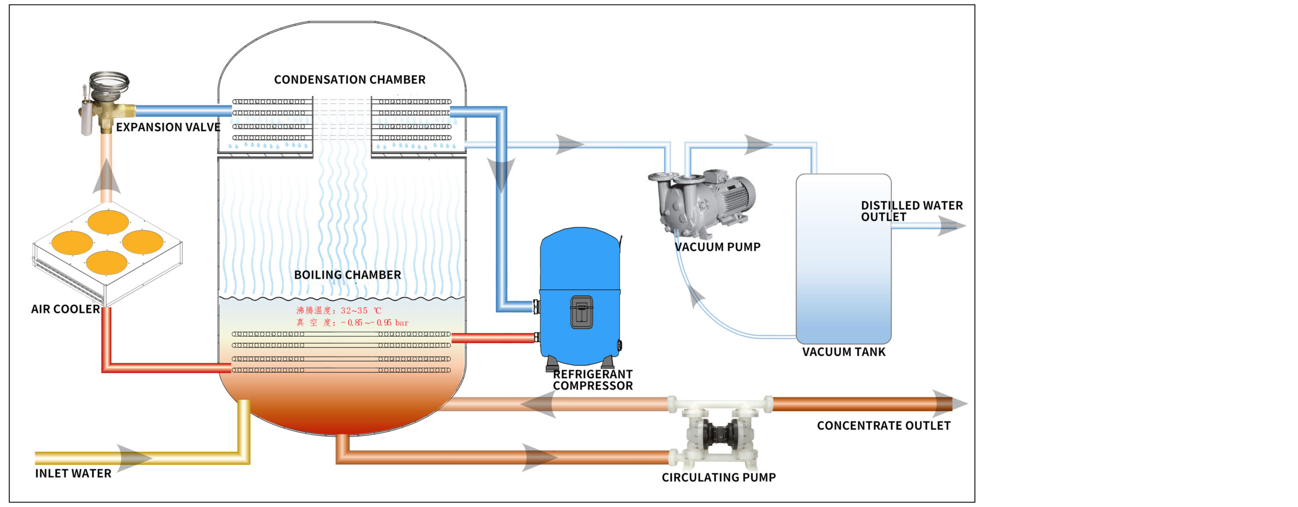 The compressor compresses the refrigerant, which then heats the liquid in the boiling chamber through a coil in the boiling chamber, causing the wastewater to evaporate at approximately 35°C. After passing through the expansion valve, the refrigerant cools down and cools the water vapor generated in the boiling tank via a coil in the condenser. The resulting condensate is discharged through pipes into the distillate tank. When the water level in the distillate tank reaches the high level, the centrifugal pump discharges the distilled water, achieving separation of the distilled water and concentrated liquid.